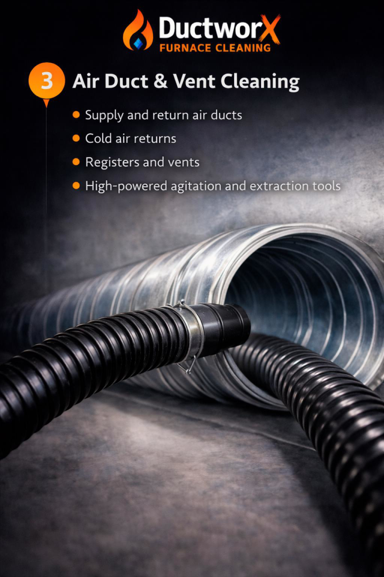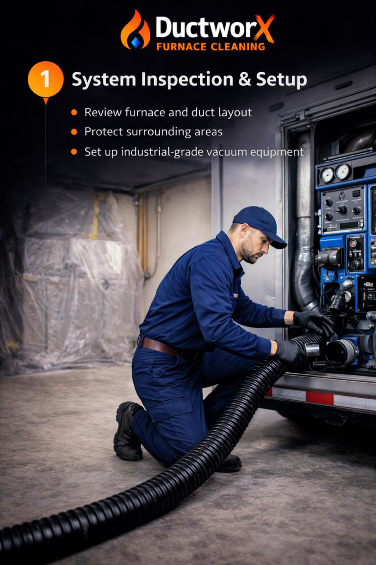 At Ductworx, we start where the system starts — the furnace. By cleaning at the source and following a documented process, we ensure contaminants are removed thoroughly and safely, not just pushed around.